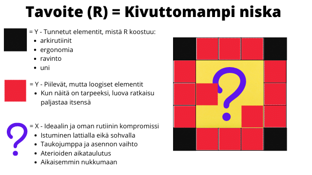 Yritämme löytää ratkaisun (X) keräämällä kaiken tiedon (Y) ja ymmärtämällä lopputuloksen (R).