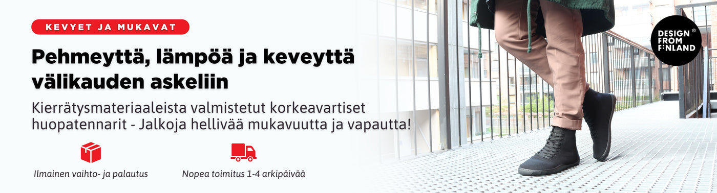 Varmista, että kengät istuvat hyvin ja tuntuvat mukavilta. Tarvittaessa voit vaihtaa tai palauttaa kengät ilmaiseksi 90 päivän sisällä tilaamisesta.
