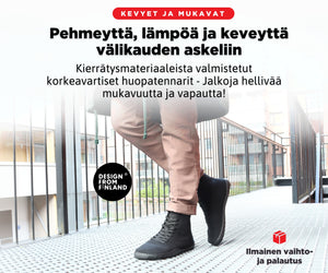 Jos paljasjalkakengät ovat uusi tuttavuus, suosittelemme ottamaan ne käyttöön pikkuhiljaa. Näin jalka saa rauhassa totutella uuteen kenkään.