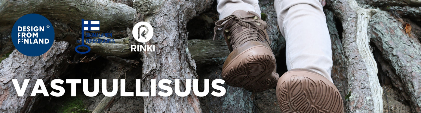 Tuotteemme pakataan kierrätetystä kartongista valmistettuihin kenkälaatikoihin Suomessa. Pakkausmateriaalit hankitaan kotimaisilta toimittajilta, ja pakkauksemme ovat helposti kierrätettäviä. Hoidamme pakkausten tuottajavastuun kuulumalla Ringin tuottajayhteisöön.